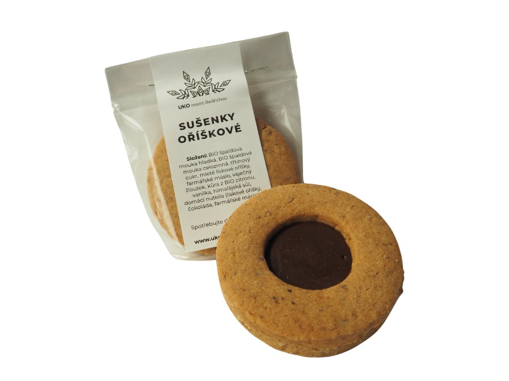 Složení: BIO špaldová mouka hladká, BIO špaldová mouka celozrnná, třtinový cukr, mleté lískové oříšky, farmářské máslo, vaječný žloutek, kůra z BIO citronu, vanilka, himalájská sůl, domácí oříškový krém (lískové oříšky, čokoláda, kakao, farmářské máslo)
